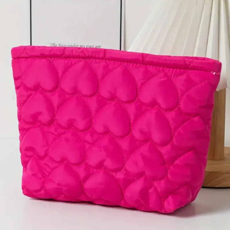 Bolsa organizadora de maquillaje de viaje con diseño de corazón - Funda de cosméticos acolchada de lavanda y blanco para artículos de tocador, cepillos, lápices. Textura suave.