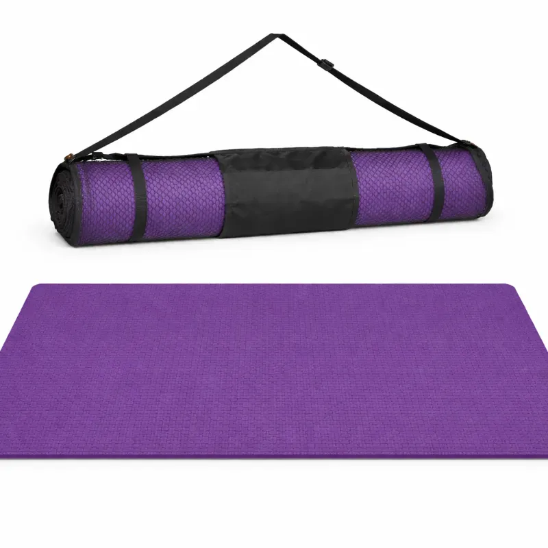 Estera de yoga color morado, fabricada en material antideslizante y de alta durabilidad. Incluye bolso transportador con malla respirable y correa ajustable, ideal para llevar cómodamente al gimnasio, clases o al aire libre. Perfecta para yoga, pilates, stretching y entrenamiento funcional.
