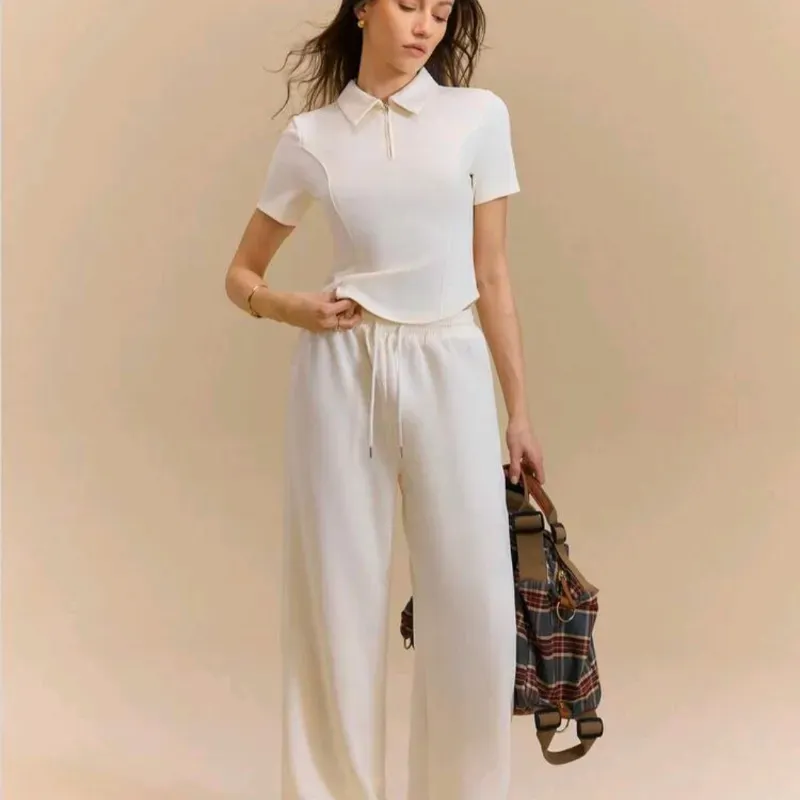 Conjunto de camiseta de polo de manga corta y pantalones rectos para mujer, de unicolor, elegante y casual para deportes y entrenamiento, para primavera/verano