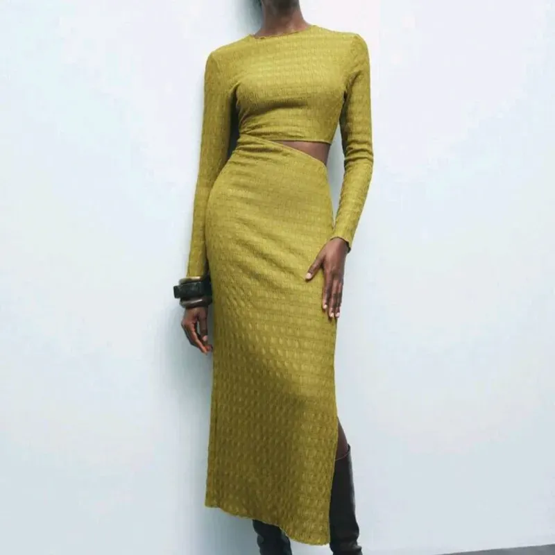 Vestido largo de punto jacquard con pliegues ondulados en verde, ajuste ceñido, diseño hueco, básico urbano versátil, otoño.