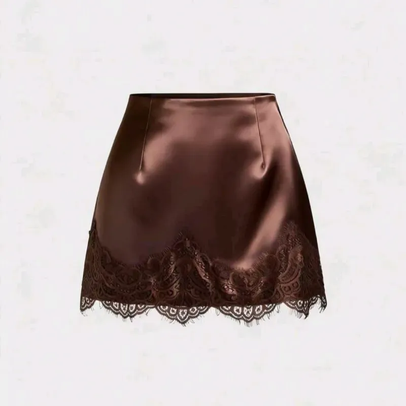 Falda casual de satén marrón con estampado floral retro francés elegante, bien chic.