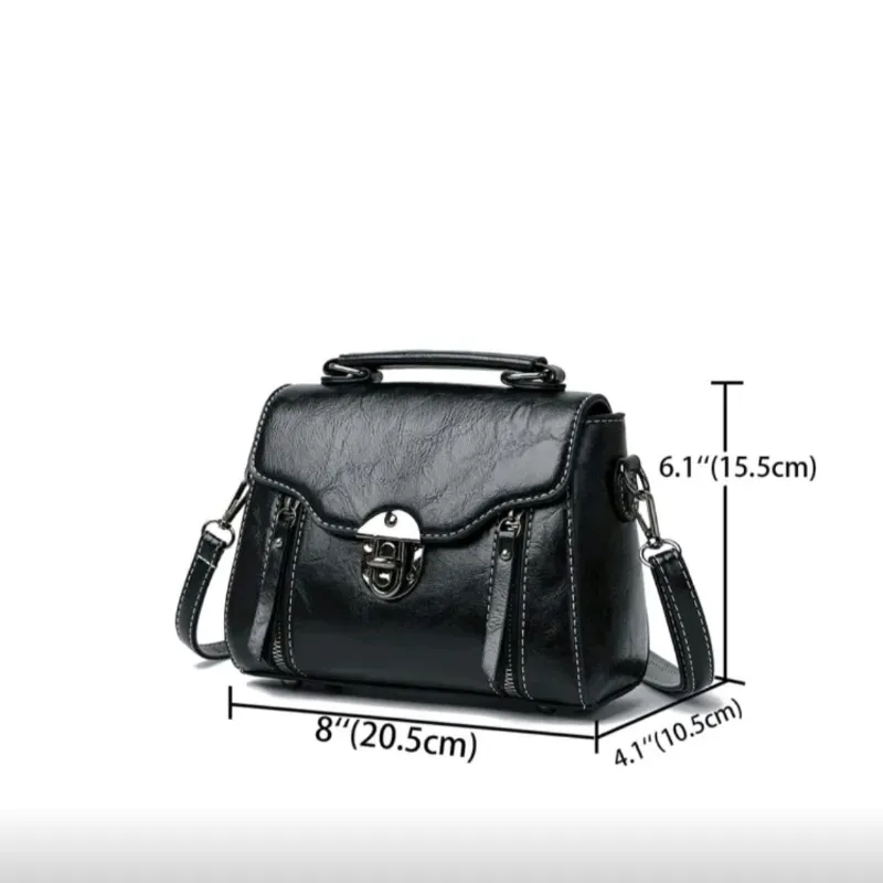 Bolso cuadrado pequeño con detalle de puntadas y asa superior.