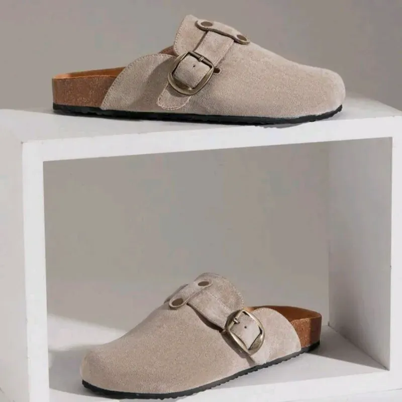 Zuecos planos de mujer con hebilla ajustable y estilo minimalista casual
