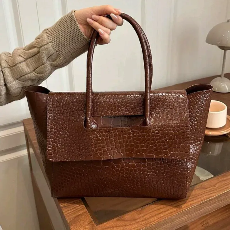 Amplio bolso tote con acabado efecto piel de cocodrilo y diseño de solapa integrada. El equilibrio ideal entre funcionalidad diaria y la tendencia más sofisticada de la temporada.