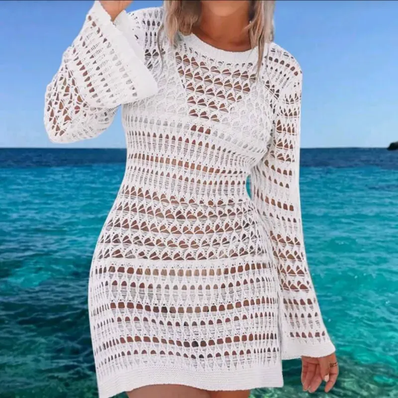 Vestido de playa de primavera y verano para mujer con diseño bohemio, sexy, calado y espalda descubierta, de manga larga y tejido a ganchillo