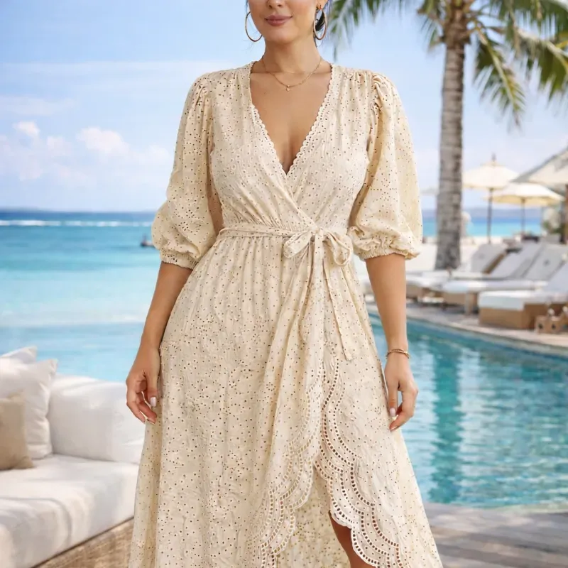 VESTIDO MAXI CON FALDA EN CAPAS Y MANGA LARGA.