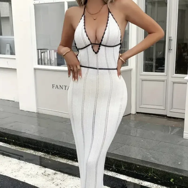 Vestido Largo de Moda para Mujer con Cuello Halter .Bloques de Color, Tejido de Alta Elasticidad, Diseño de Espalda Abierta, Ideal para Playa y Vacaciones, Elegante y Sexy