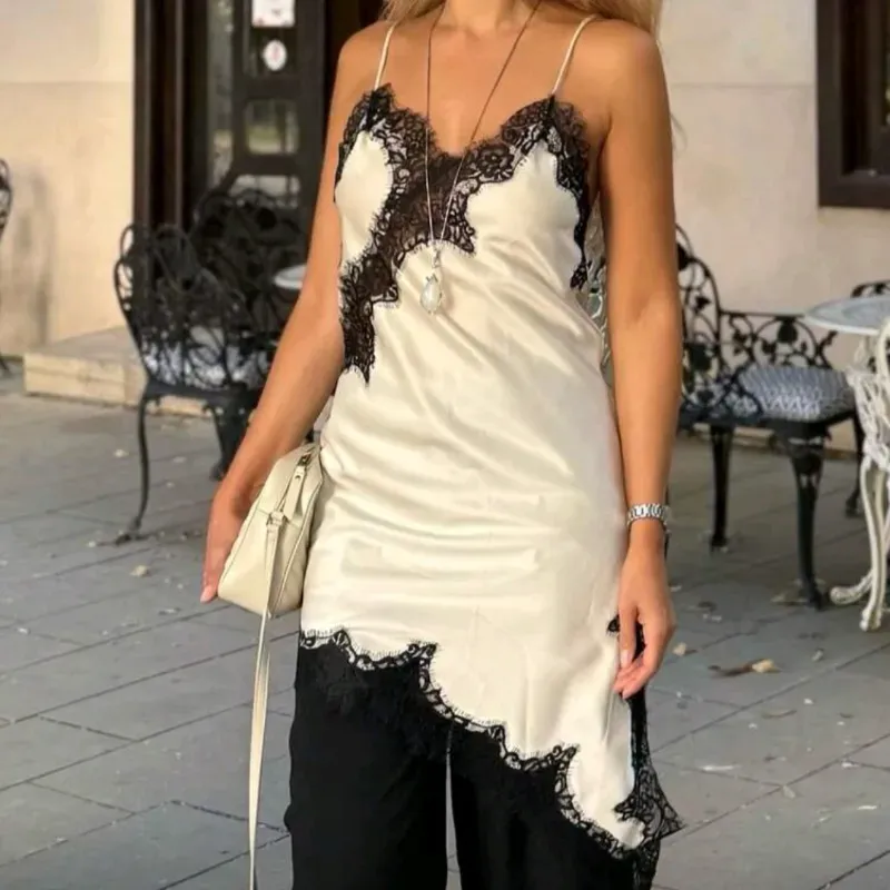 Vestido de Encaje , Corto Asimétrico sin Mangas con Tirantes Finos y Encaje Exagerado. Elegante.
