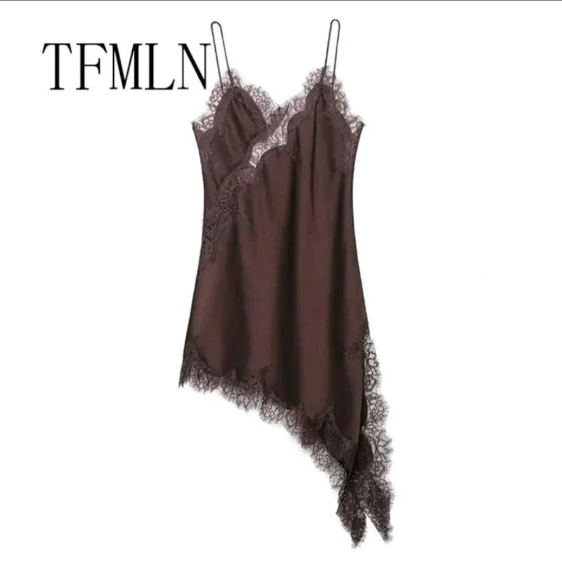 Vestido de encaje marrón para mujer con diseño asimétrico, estilo sin mangas, cuello en V y corte sin espalda, perfecto para fiestas y eventos Y2K. Un elegante vestido de club nocturno para mujeres.