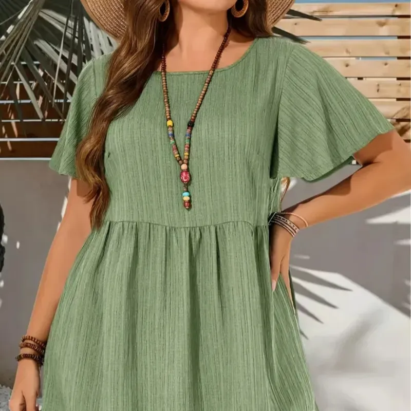 La esencia del estilo bohemio en un tono verde salvia refrescante. Este vestido destaca por su tejido con textura natural, mangas acampanadas y un delicado volante en el bajo. Una prenda ligera y fluida diseñada para ofrecer máxima comodidad sin perder el estilo.