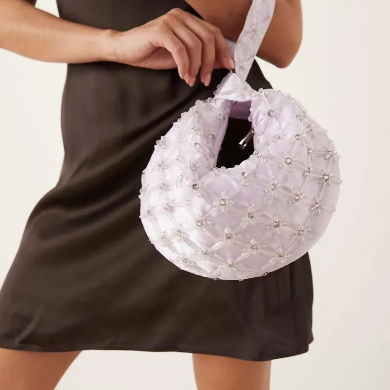 BOLSO CLUTCH LILA TENUE DE SATEN ENTRELAZADAS Y ABOLORIOS