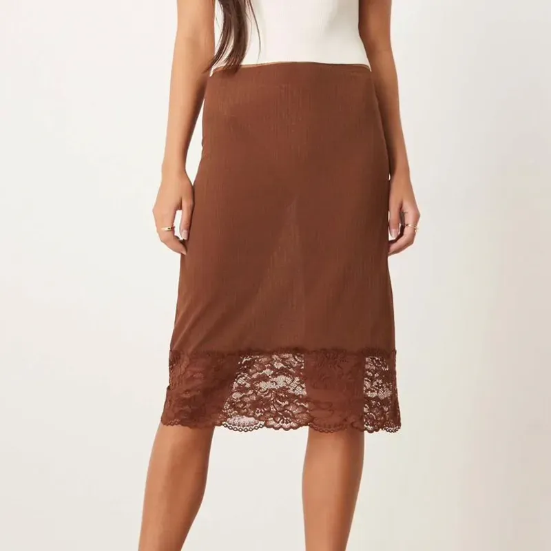 FALDA MIDI MARRON POR LA RODILLA DE GASA TRANSPARENTE ACANALADA