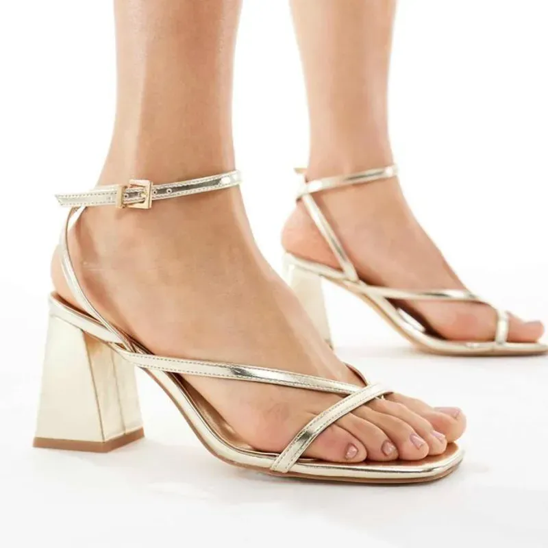SANDALIAS DORADAS DE TACON MEDIO GRUESO CON DISEÑO DE TIRAS