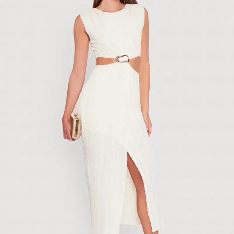 Vestido Blanco Largo Estilo Conjunto Broche en el Frente