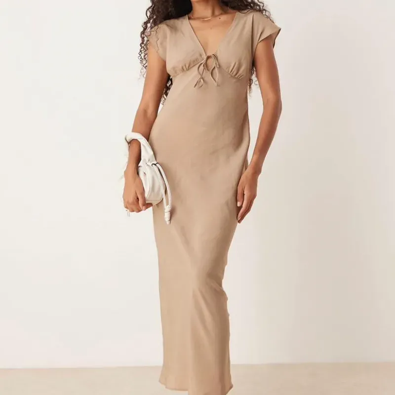 VESTIDO LARGO COLOR PIEDRA DE CORTE AL BIES