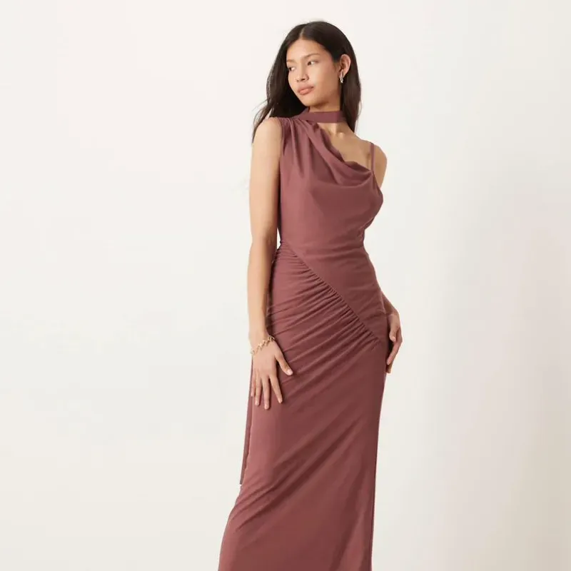 VESTIDO ROSA EMPOLVADO ASIMETRICO CON DETALLE DE FULAR ESTRECHO