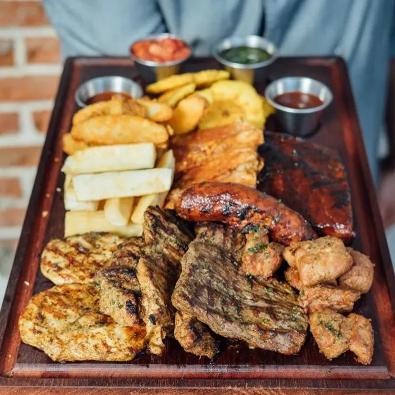 ( Cocote ahumado biste de pollo, biste de cerdo y rueda de pescado con bastones de chorizo y beico crujiente acompañado de papa batalla)