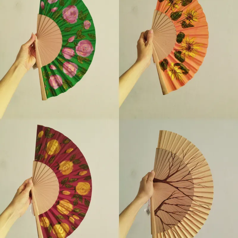 Abanicos de tela y madera pintados a mano de motivos florales y plantas. Consultar disponibilidad.