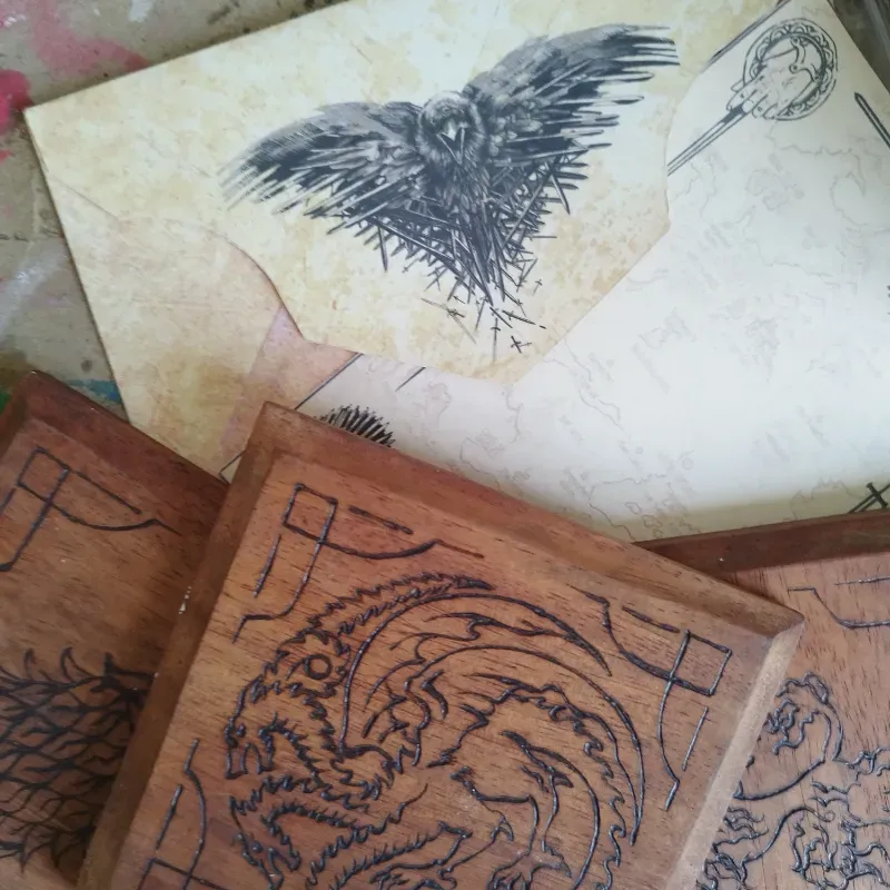 Un sobre con postal de juego de tronos y un posavasos de emblema pirograbado.