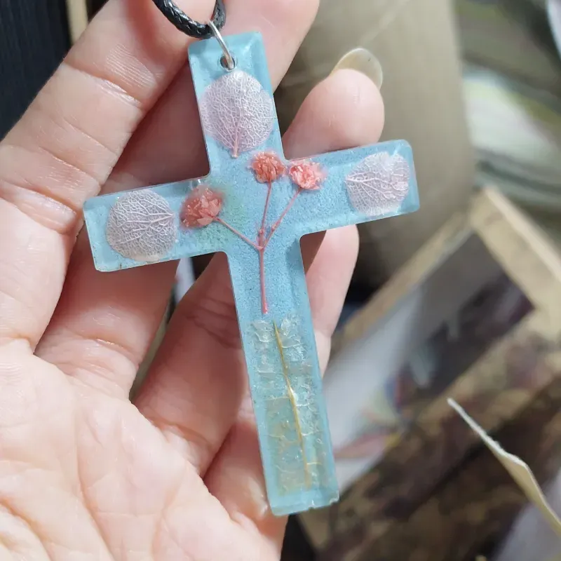 Cruces estilo rosario decoradas con perlas flores y colores en resina.