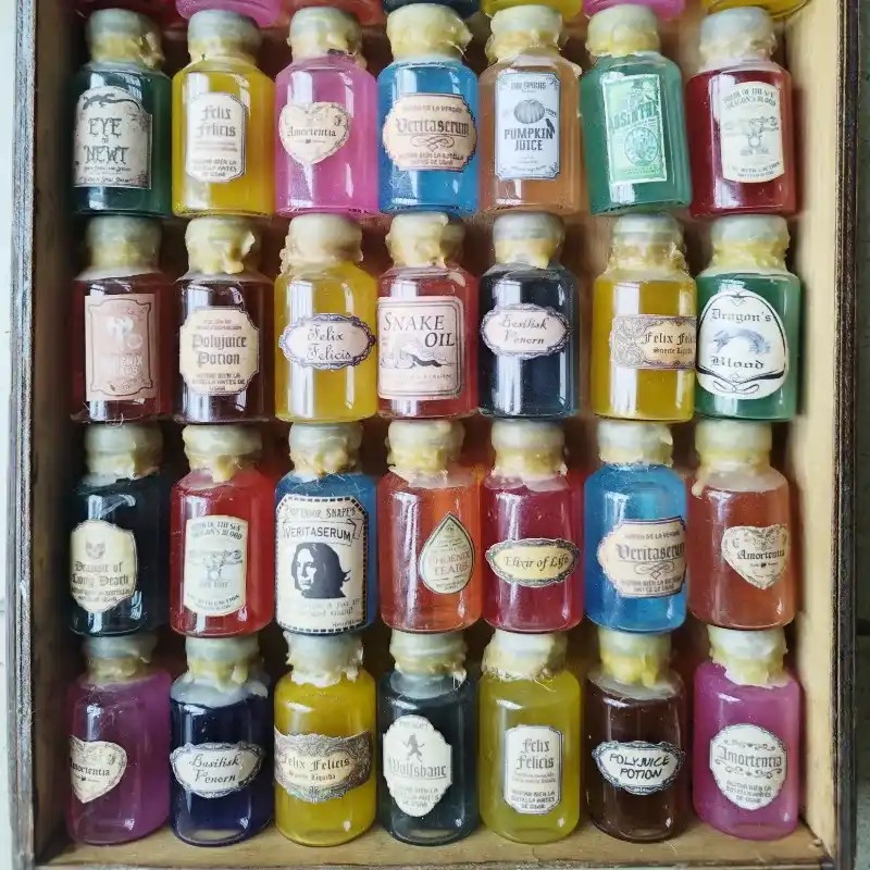 Frascos recuperados generalmente de 20ml de medida. Variedad de etiquetas y colores. Cera de abejas, yute, corchos.