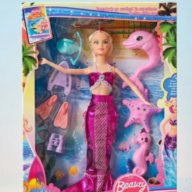 El set completo para las amantes del mar. Incluye muñeca sirena brillante, delfín, caballito de mar, estrella, aletas y visor. ¡Perfecto para crear historias bajo el agua!