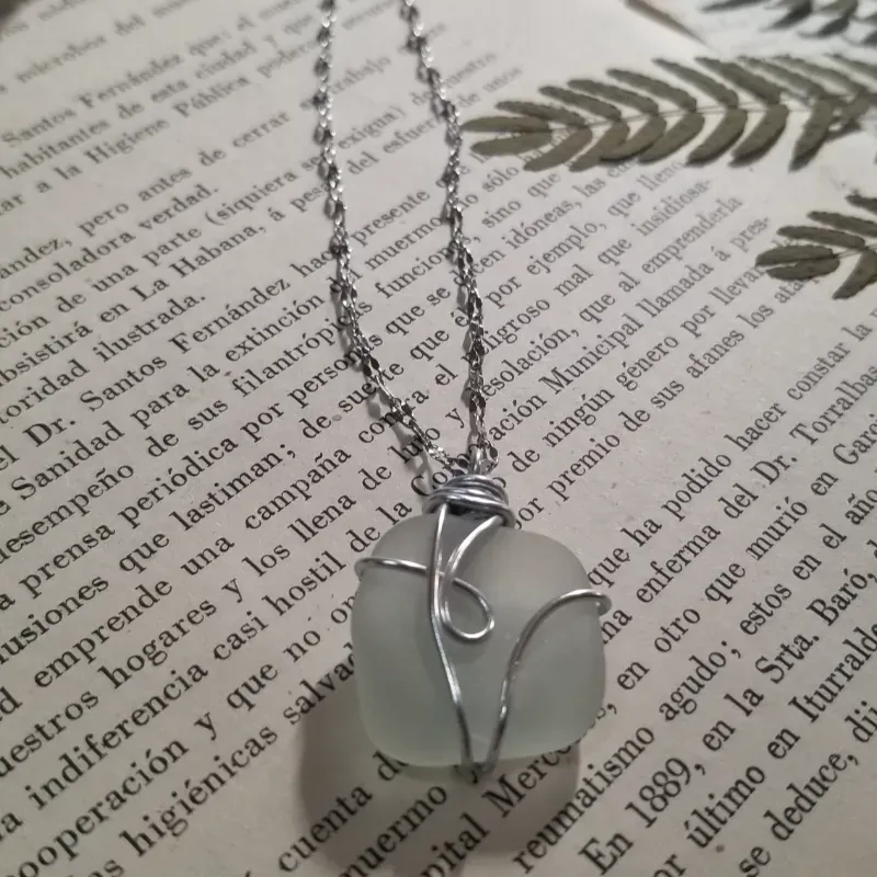 Joyería única y artesanal,creada con la delicada técnica del alambrismo, cadena de acero inoxidable y cristales pulidos por el mar