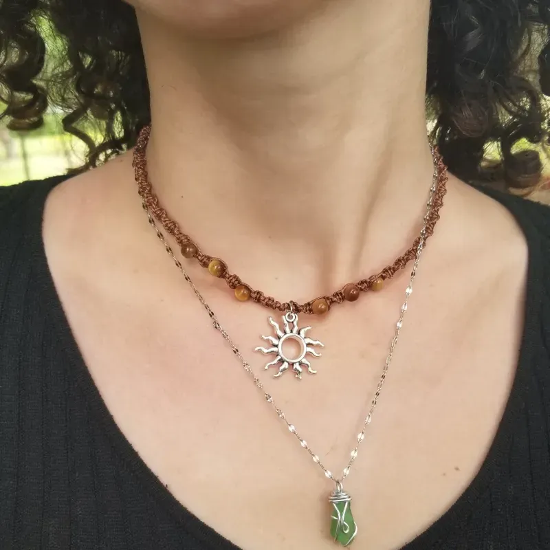 Lleva contigo la energía cálida del sol y la protección de la tierra.Este collar único, tejido a mano con dedicación, es más que un accesorio , es un talismán personal que combina la luz con la fuerza de la naturaleza. Ideal para almas libres y amantes del estilo boho-chic.