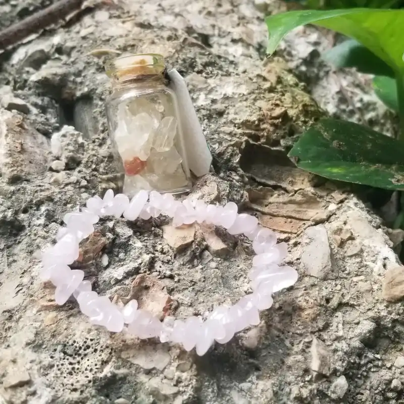 1. Pulsera de Cuarzo Rosa: Hecha con cuentas de cuarzo rosa natural, en hilo elástico resistente para un ajuste perfecto.
