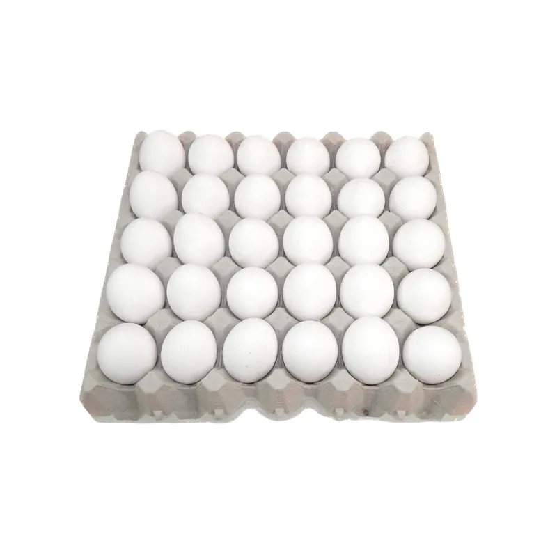 Bandeja de huevos blancos frescos, presentada en un envase de cartón reciclado tipo alveolar. Contiene 30 unidades, dispuestas de forma ordenada para garantizar su protección y fácil transporte.