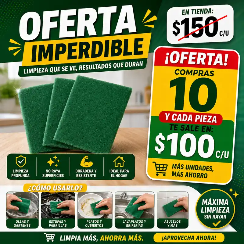 Estropajo fabricado con fibra sintética resistente, ideal para la limpieza profunda de superficies difíciles. Su textura abrasiva permite eliminar grasa, restos de comida y suciedad incrustada de ollas, sartenes, parrillas y utensilios de cocina no delicados.