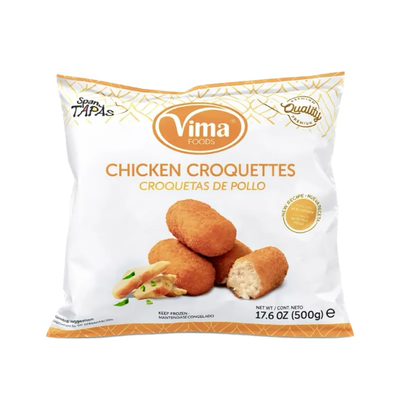 Eleva tus aperitivos con las Croquetas de Pollo de Vima Foods. Esta versión de las clásicas "Spanish Tapas" destaca por su nueva receta elaborada con pollo auténtico, ofreciendo una textura cremosa por dentro y un acabado perfectamente crujiente