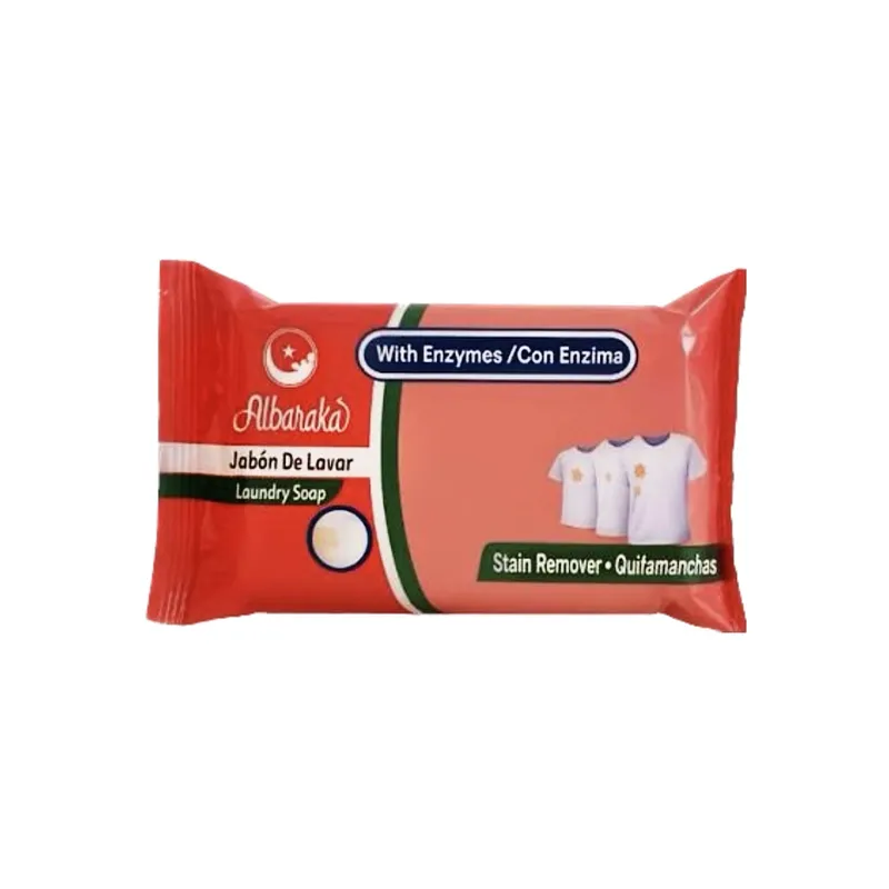 Jabón de Lavar Albaraka con Enzimas es un jabón sólido especialmente formulado para el lavado de ropa. Su fórmula con enzimas actúa eficazmente como quitamanchas, ayudando a remover manchas difíciles como grasa, sudor y suciedad adherida, sin dañar las fibras de las prendas. Ideal para ropa blanca y de color.