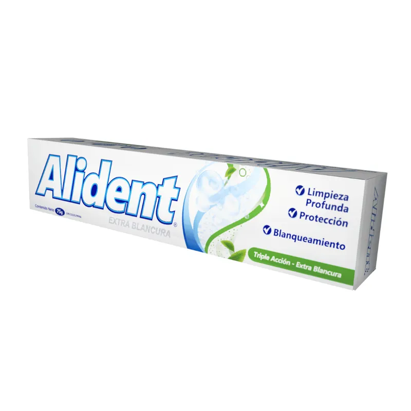Asegura una higiene bucal completa con la pasta dental Alident Triple Action. Su fórmula avanzada está diseñada para ofrecer tres beneficios clave en un solo cepillado, dejando tu boca fresca y protegida.