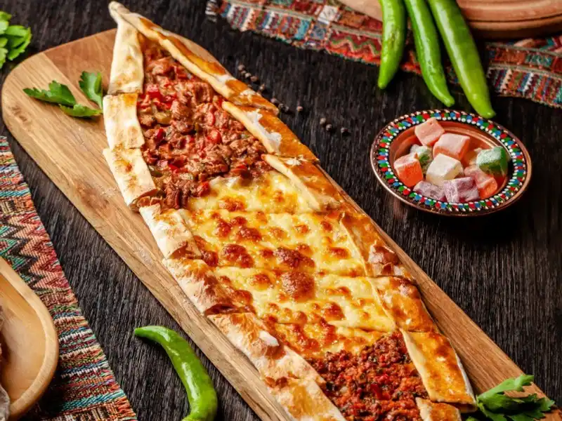 Masa fina y crujiente en forma de barca, cubierta con ingredientes frescos y especias orientales, horneada al estilo tradicional turco para un sabor auténtico y delicioso.
