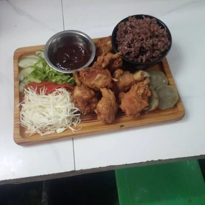 Alitas de pollo fritas y salsa BBQ , incluye guarniciones, ensaladas y viandas
