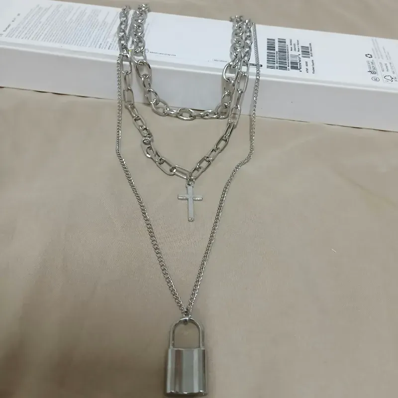 Collares de 3 capas:cadena gruesa,cadena de cruz y una cadena mas sencilla con un colgante de candado