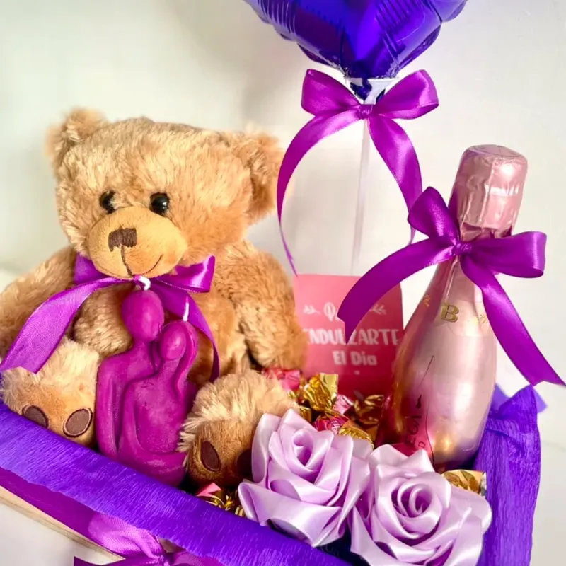 • Bandejita de madera decorada con globo. • Peluche mediano • Mini vino espumoso • Vela aromática de pareja • 10 bombones LEXUS • 2 rosas eternas • 1 postal