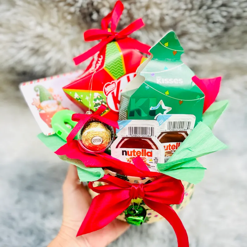 El pack más completo de tus chocolates preferidos: - Estrella KitKat - Pinito Kisses - Mini Nutellas - Ferrero Rocher - Bastoncito de caramelos