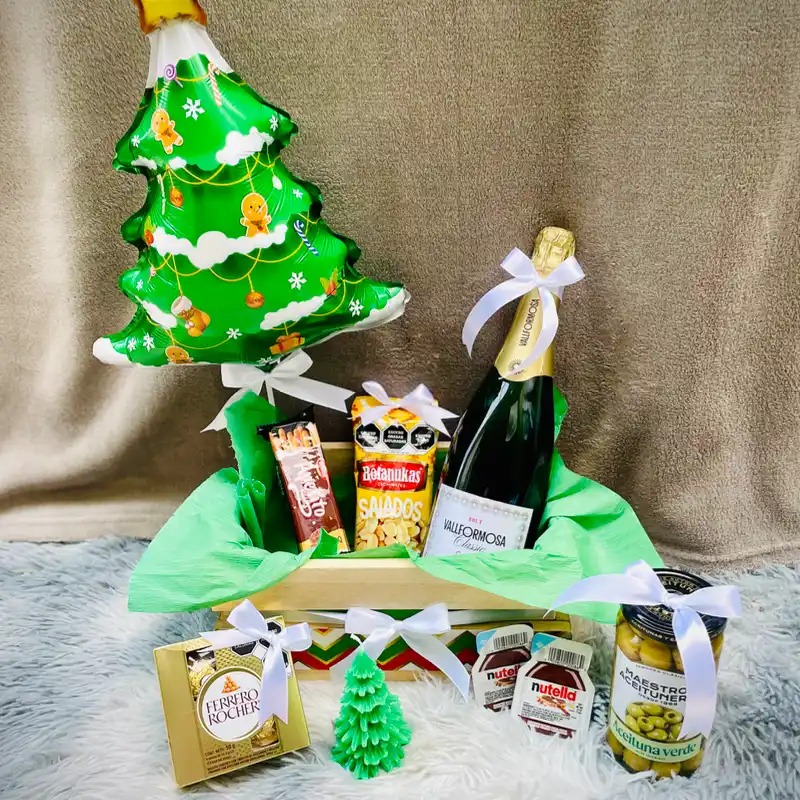 Cesta 1. - vino espumoso - aceitunas - Pack de 4 ferrero rocher - 2 mini nutellas - maní salado - palitos BBQ - velita de pino