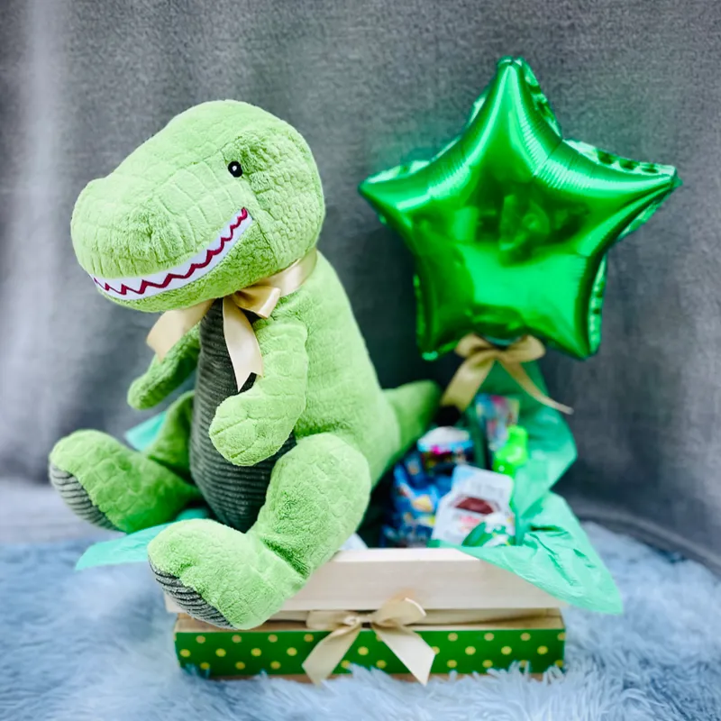 Cesta 10: - peluche dinosaurio TRex grande - mini nutella - huevo sorpresa - 10 confituras mixtas