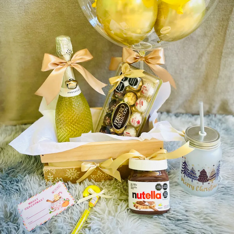 Caja de madera con globo burbuja: - vino espumoso Freixenet - bombones FERRERO ROCHER Collection - Nutella - Jarra nevada con pitillo - Bastoncito de caramelo