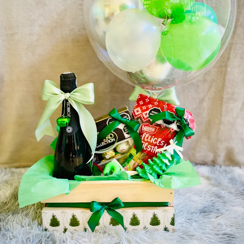 Caja de madera decorada con globo burbuja: - vino espumoso - bombones FERRERO ROCHER Collection - Nutella - bota surtida de chocolates finos - bastoncito de caramelos - vela pinito