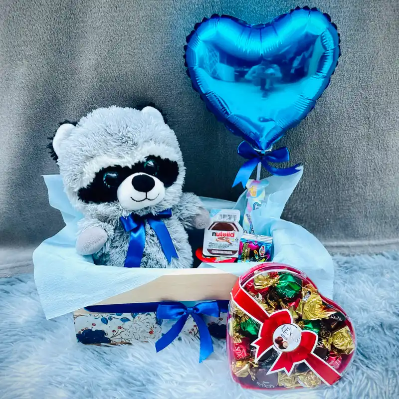 Cesta 8: - peluche mapache - caja de bombones - mini nutella - 10 confituras mixtas