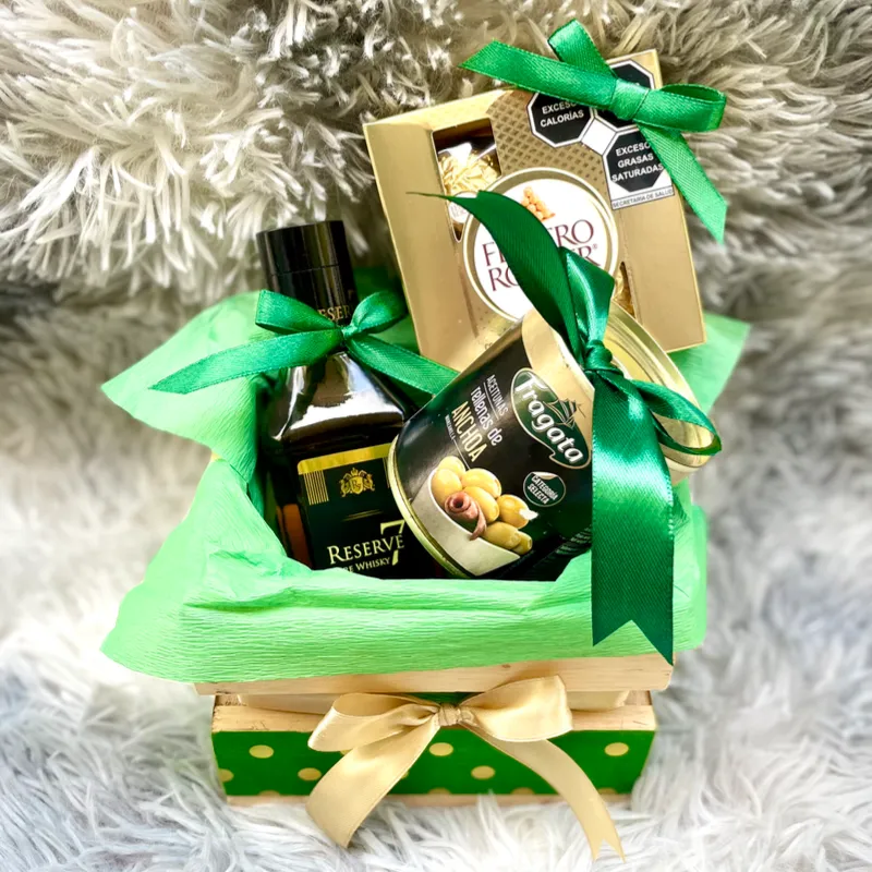 Cajita de madera con: - mini whisky - aceitunas con anchoa - bombones Ferrero Rocher - postal