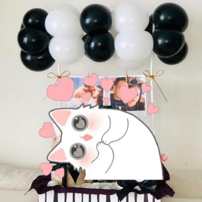 Bandejita de madera decorada con globos tipo nube, cartel de felicitación o fotos polaroid.