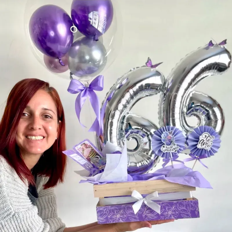 • Caja de madera decorada lazo, 2 globos de números, globo burbuja, rosetones y postal.