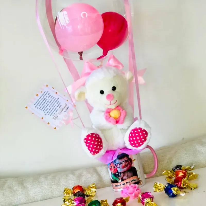 • Jarra de cerámica personalizada, decorada con globo burbuja y postal. • Peluche mediano • 10 bombones • 1 velita