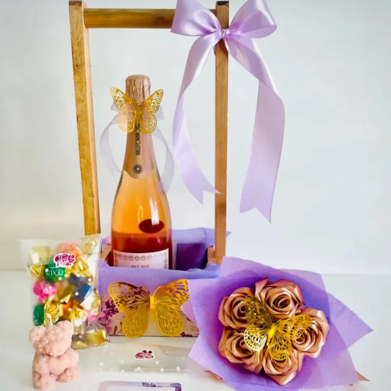 • Cesta de madera decorada con lazo • Vino espumoso • 10 bombones • 1 velita • Ramo de 5 rosas eternas • Postal