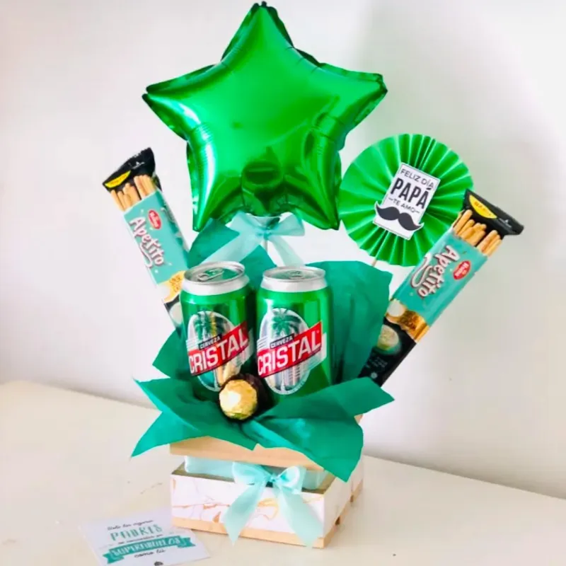 Caja pequeña decorada con decoupage, globo y rosetón • 2 cervezas de lata • 2 chuches • 1 bombón FERRERO ROCHER • 1 postal